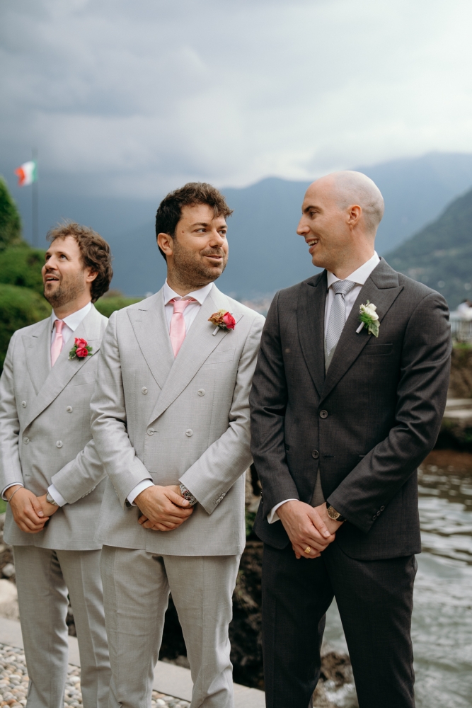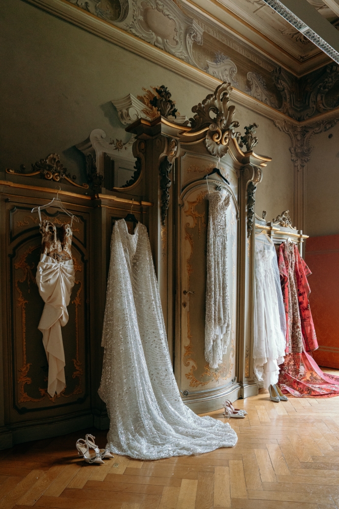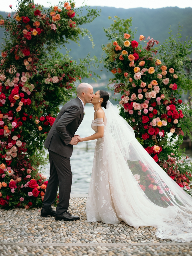 Throughout the day, Thalia changed into four different dresses, including an exquisite Berta Bridal gown for the lakeside ceremony and an elegant evening gown for the reception. Nicolò complemented his bride's style with refined elegance at every step.
