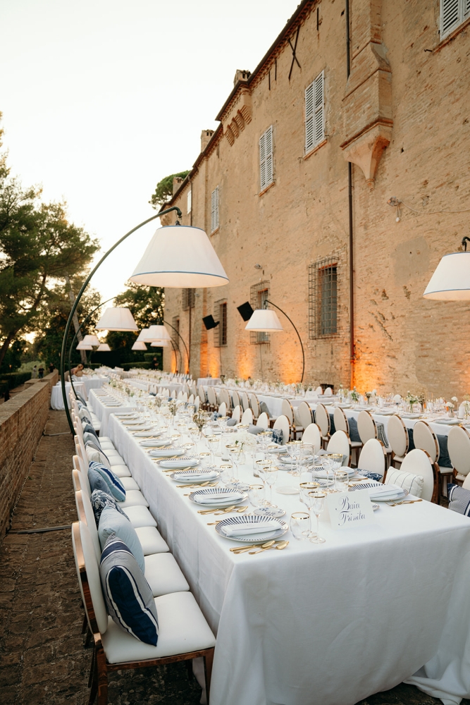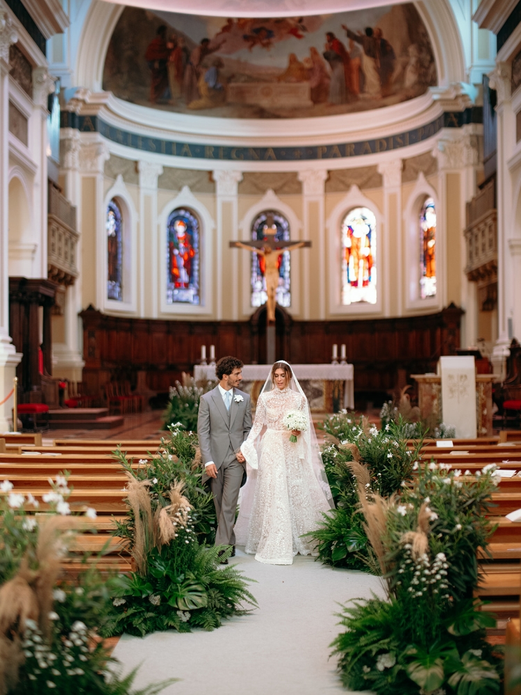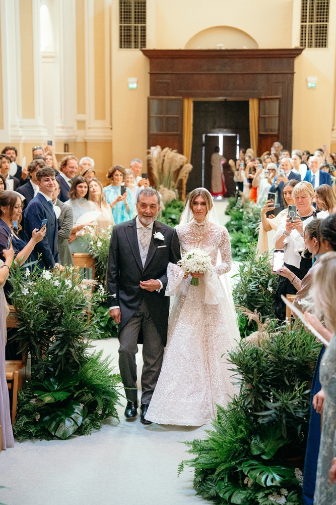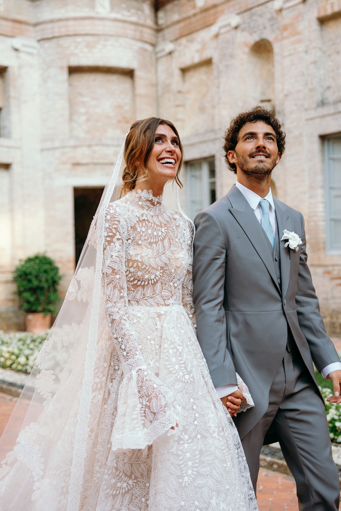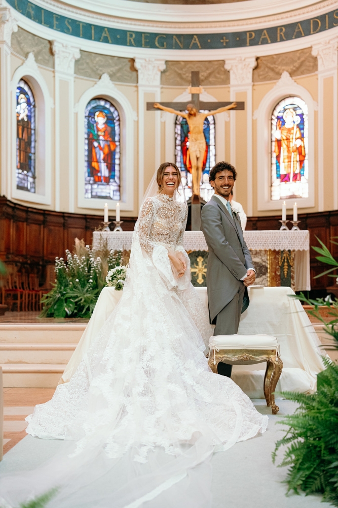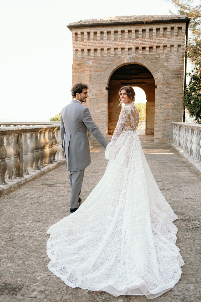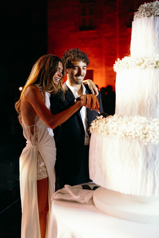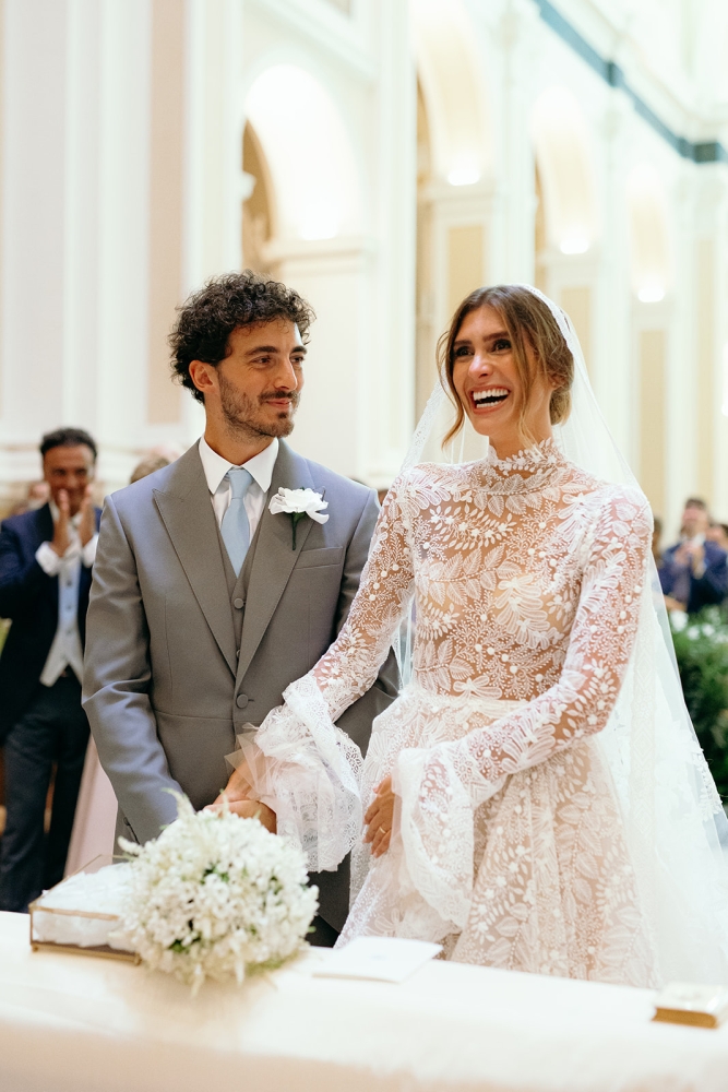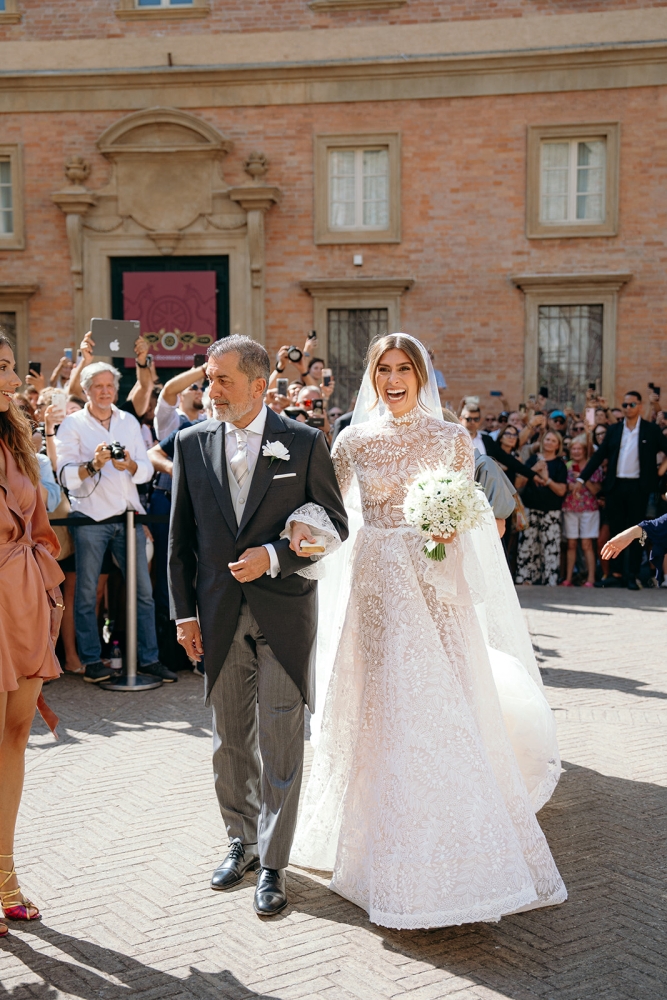La cerimonia religiosa si è tenuta nel Duomo di Pesaro, una cornice storica e luminosa che ha accolto la coppia per il loro sì, circondata da familiari e amici. Dopo la cerimonia, il ricevimento si è spostato nella straordinaria Villa Imperiale, una delle ville rinascimentali più belle d’Italia, immersa nel verde del Parco San Bartolo e affacciata sul mare.