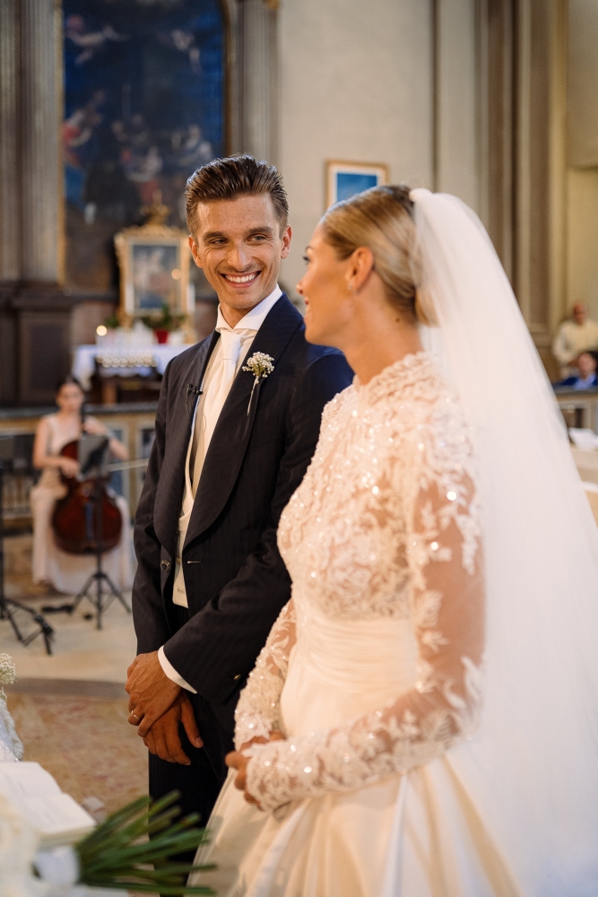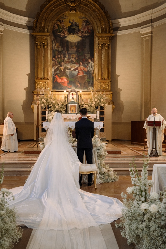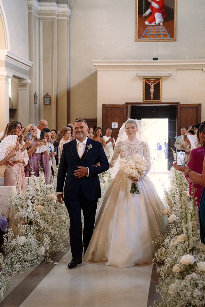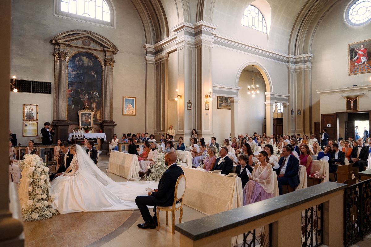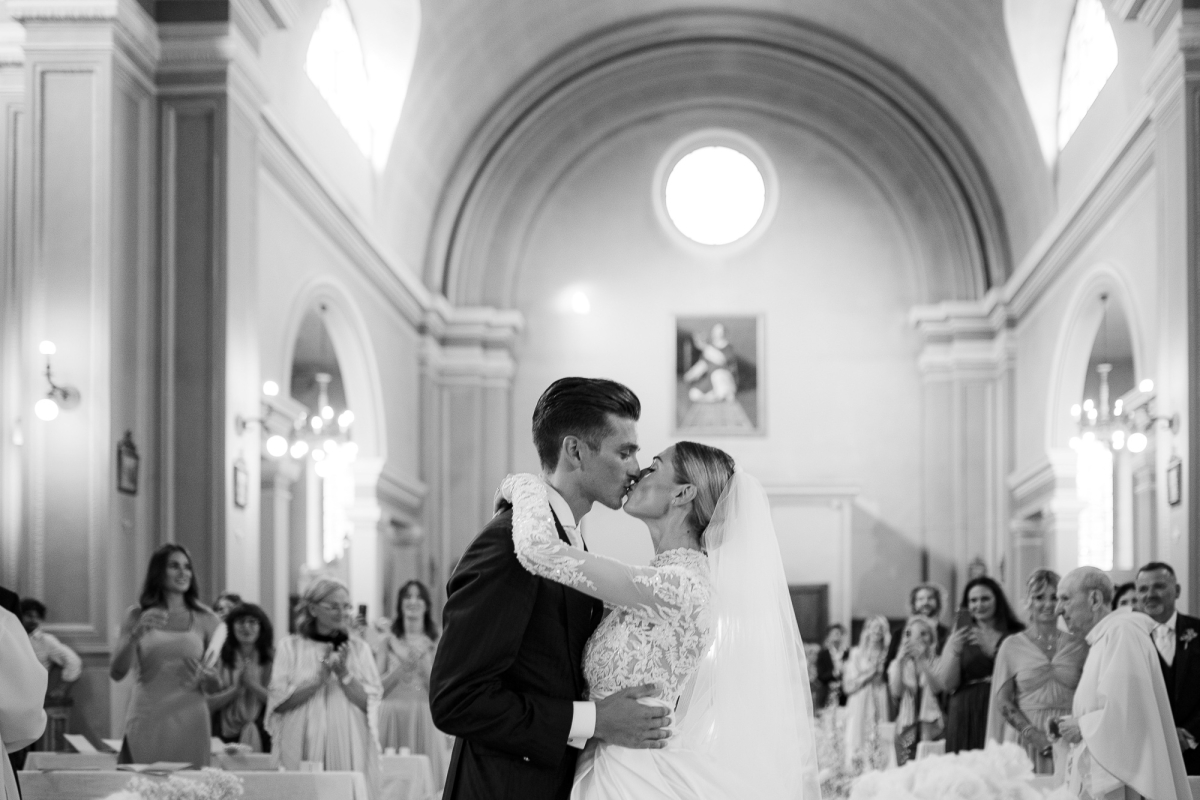 Matrimonio Luca Marini e Marta a Villa Cattani Stuart, Pesaro. Abito sposa Atelier Emé, wedding planner Eva Presutti, fiori di Andrea Patrizi. Cerimonia in chiesa con decorazioni floreali bianche e ricevimento sotto eleganti lampadari di cristallo. Un evento raffinato e senza tempo.