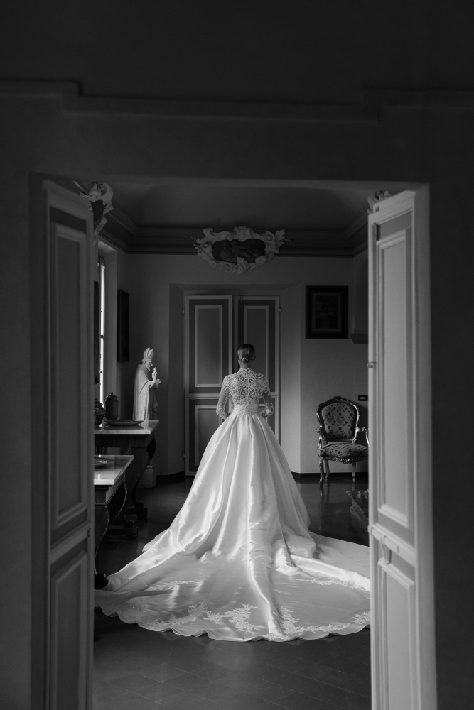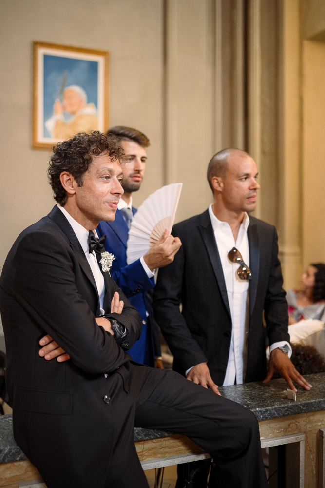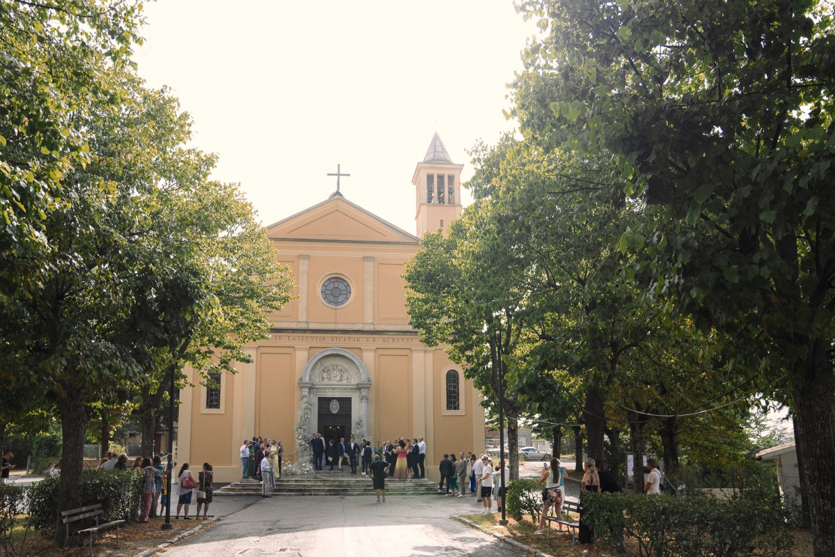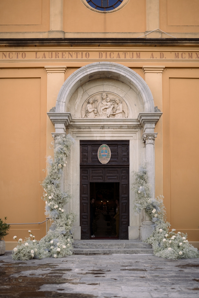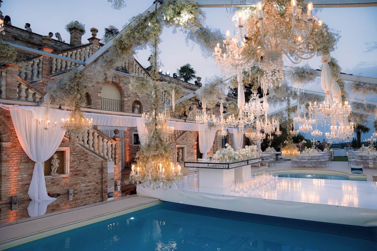 Matrimonio Luca Marini e Marta a Villa Cattani Stuart, Pesaro. Abito sposa Atelier Emé, wedding planner Eva Presutti, fiori di Andrea Patrizi. Cerimonia in chiesa con decorazioni floreali bianche e ricevimento sotto eleganti lampadari di cristallo. Un evento raffinato e senza tempo.