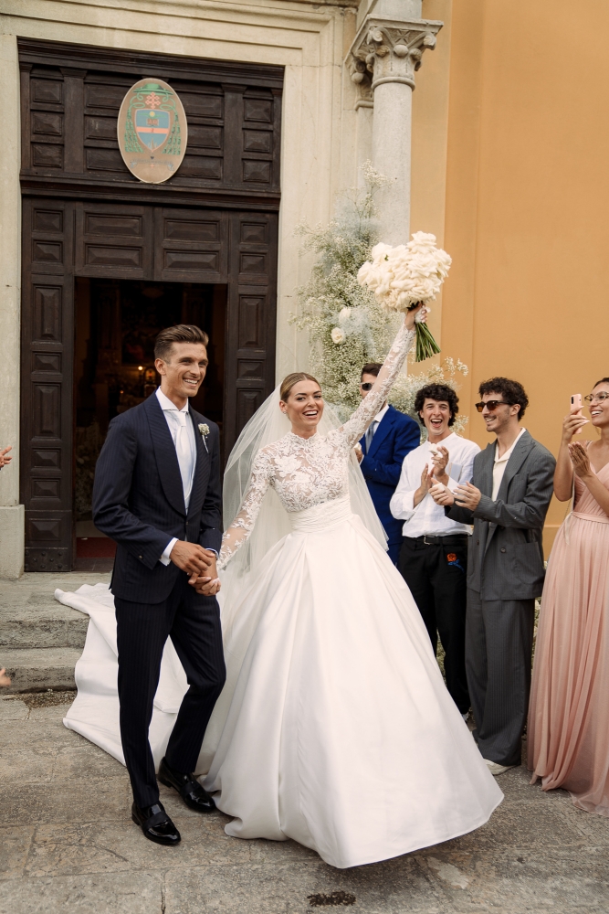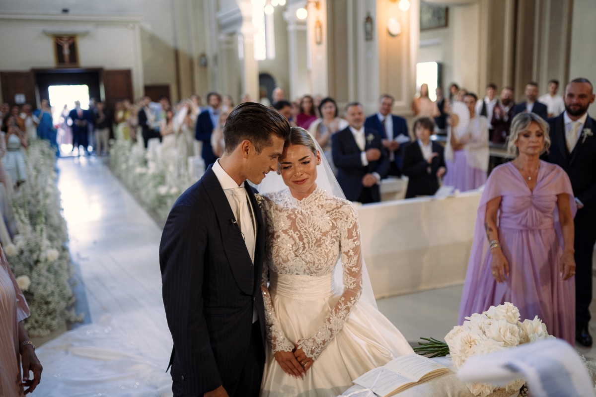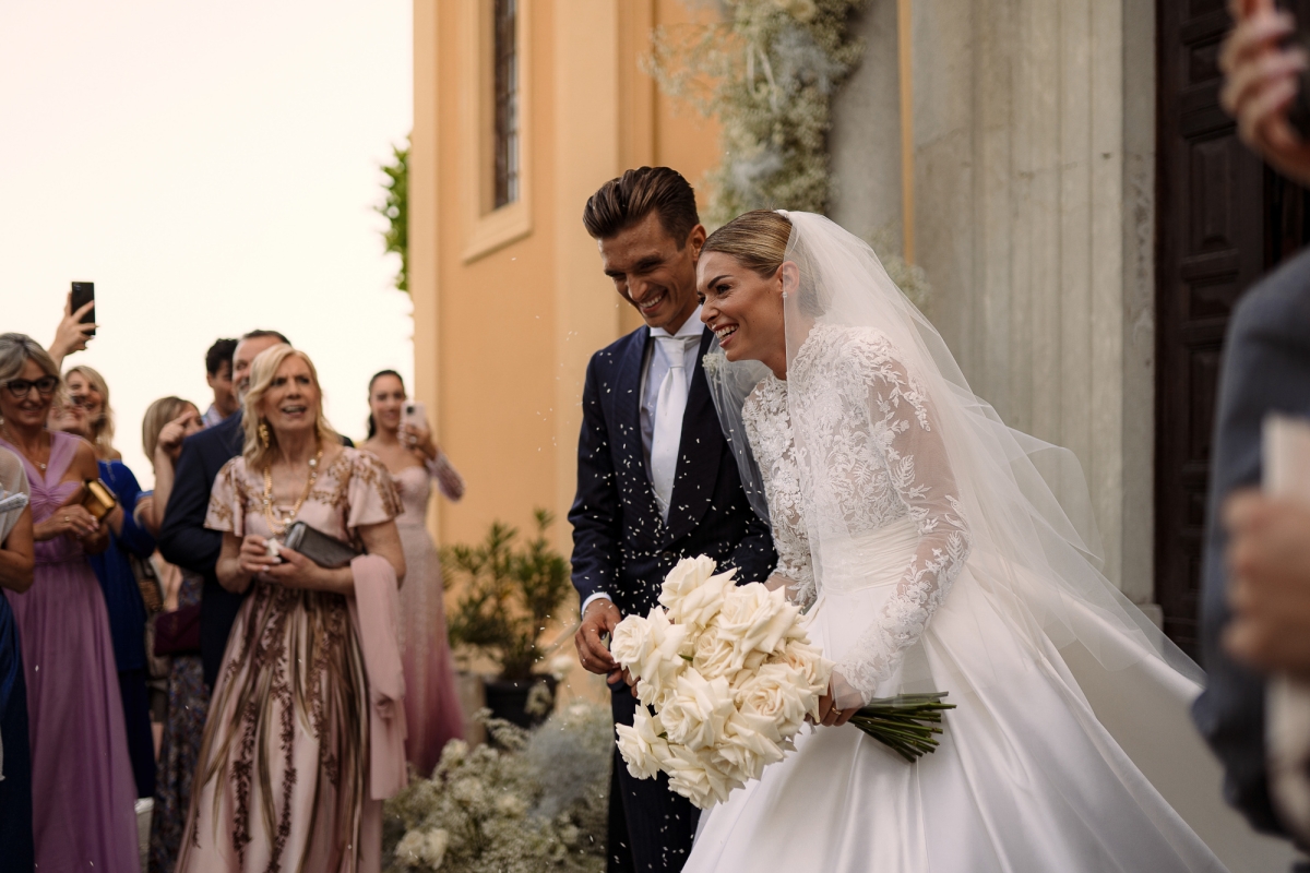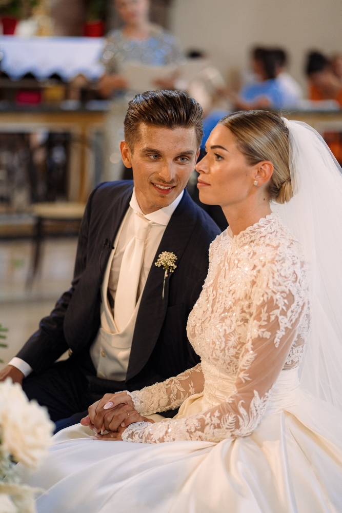 Marta ha indossato un abito da sposa firmato Atelier Emé, un capolavoro di pizzo e dettagli sartoriali che ha reso la sua figura ancora più luminosa. La cerimonia religiosa si è svolta in una chiesa avvolta da fiori bianchi, creando un'atmosfera intima e sofisticata.