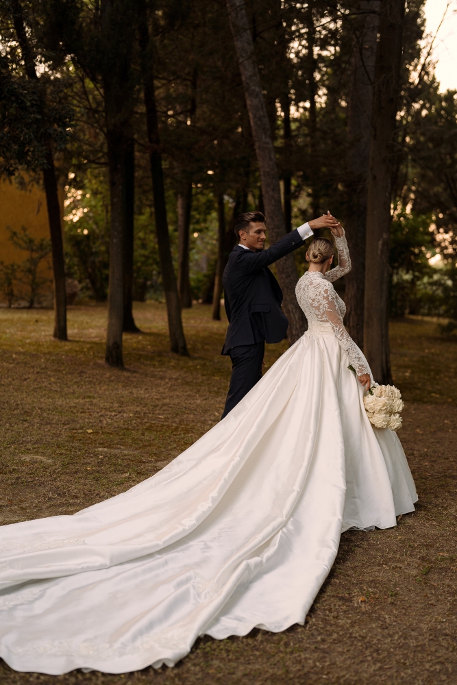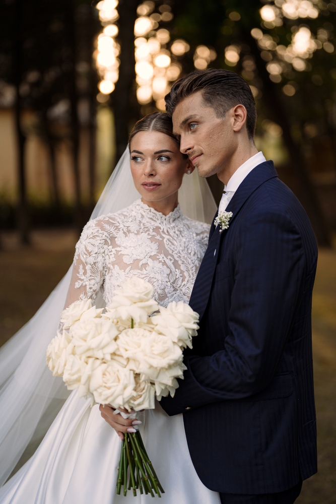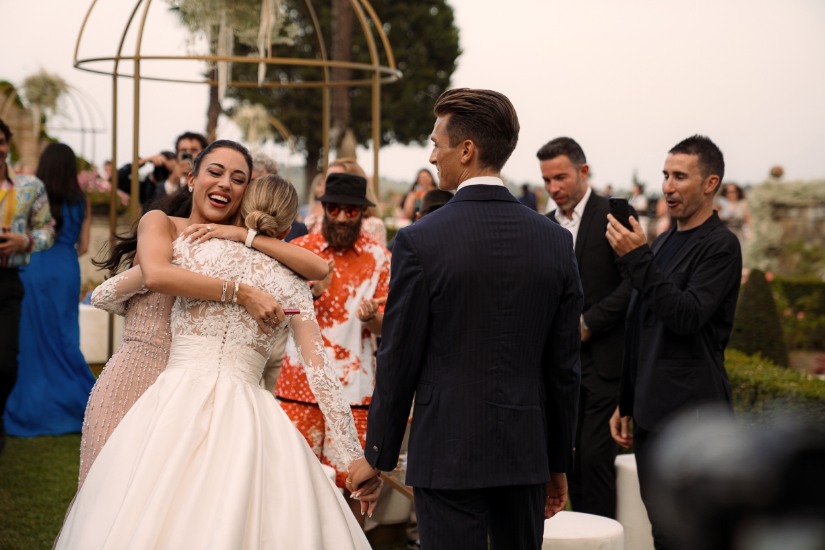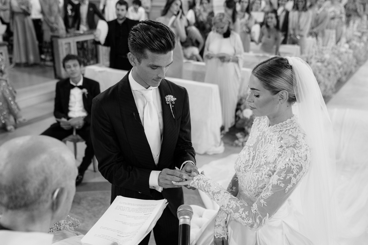 Marta ha indossato un abito da sposa firmato Atelier Emé, un capolavoro di pizzo e dettagli sartoriali che ha reso la sua figura ancora più luminosa. La cerimonia religiosa si è svolta in una chiesa avvolta da fiori bianchi, creando un'atmosfera intima e sofisticata.