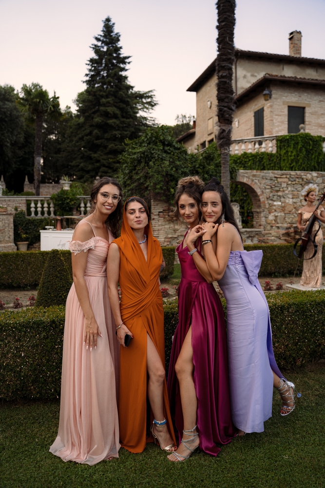 Dopo la celebrazione, gli sposi hanno raggiunto Villa Cattani a bordo di una elegante Mercedes d'epoca, accolti dagli applausi degli ospiti. La cena si è svolta in una magica ambientazione con lampadari di cristallo sospesi e dettagli floreali che rendevano l'atmosfera ancora più incantevole.